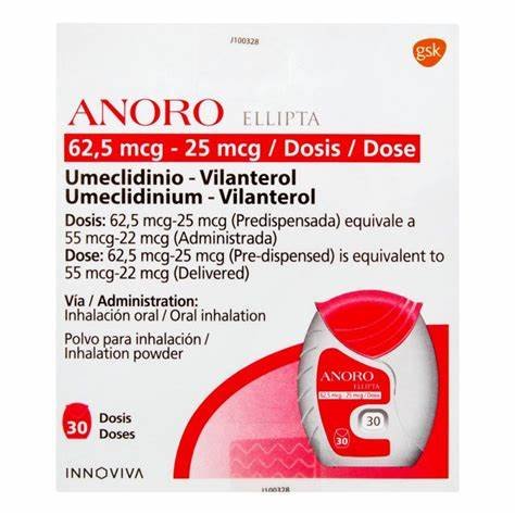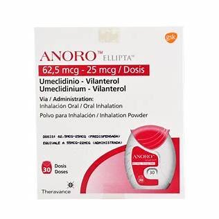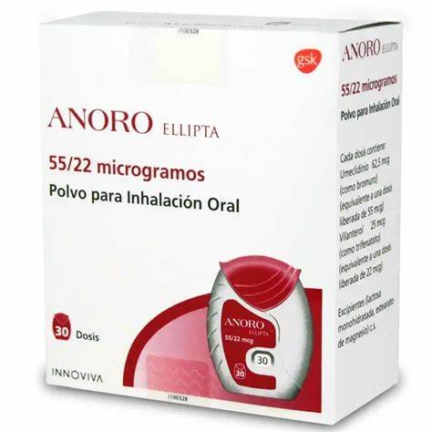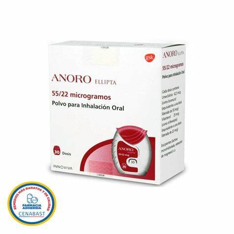 Anoro Ellipta es un medicamento inhalado que combina dos principios activos: bromuro de umeclidinio y vilanterol. Estos componentes actúan como broncodilatadores, relajando los músculos de las vías respiratorias y facilitando la respiración en pacientes con enfermedad pulmonar obstructiva crónica (EPOC), que incluye condiciones como la bronquitis crónica y el enfisema. El inhalador Ellipta está diseñado para administrar una dosis diaria, proporcionando un alivio sostenido de los síntomas respiratorios. Cada inhalación suministra una dosis predispensada de 62.5 microgramos de umeclidinio y 25 microgramos de vilanterol. Es importante utilizar Anoro Ellipta regularmente, siguiendo las indicaciones médicas, incluso si no se presentan síntomas, para mantener el control de la EPOC. Este medicamento no está indicado para el alivio inmediato de episodios agudos de dificultad respiratoria. Los efectos secundarios más comunes pueden incluir dolor de cabeza, nasofaringitis y tos. Se recomienda consultar con un profesional de la salud para determinar la idoneidad de este tratamiento y recibir instrucciones precisas sobre su uso