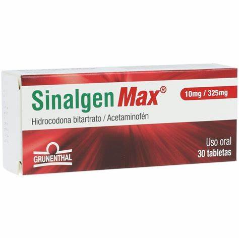 Presentación: Sinalgen Max se presenta en una caja que contiene 30 tabletas, cada una con una combinación de 10 mg de hidrocodona bitartrato y 325 mg de acetaminofén.